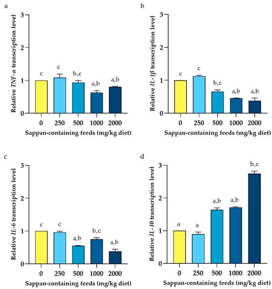 Relative transcript levels (means ± S.D.) of immune-related genes for interleukin-1beta (a), interleukin-6 (b), tumor necrosis factor-alpha (c), and interleukin-10 (d) from liver tissue of late-phase laying hens at 8 weeks following diet supplementation with Caesalpinia sappan extract ranging from 0 to 2000 mg/kg diet. Data were analyzed by Kruskal–Wallis H test. Bars with different letters indicated values significantly different among the supplemented groups (p < 0.05).