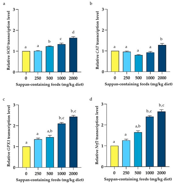 Relative transcript levels (means ± S.D.) of antioxidant-related genes for catalase (a), superoxide dismutase (b), glutathione peroxidase 1 (c), and nuclear factor erythroid 2-related factor 2 (d) from liver tissue of late-phase laying hens at 8 weeks following diet supplementation with Caesalpinia sappan extract ranging from 0 to 2000 mg/kg diet. Data were analyzed by using Kruskal–Wallis H test. Bars with different letters indicated values significantly different among the supplemented groups (p < 0.05).