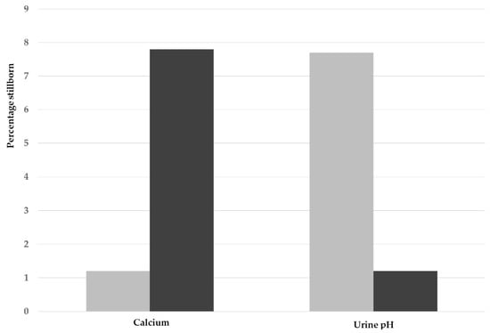 Effect of high (grey bars) and low (black bars) concentrations of serum calcium (low < 2.50 mmol/L; high ≥ 2.50 mmol/L) and urine pH (low < 7.0; high ≥ 7.0) on the proportion of stillborn piglets per litter for the bootstrapped data.