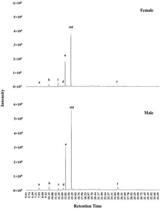Representative chromatogram of volatiles in the urine of male and female cats. Letters a–f correspond to the candidate molecules in Table 2. Std: standard.