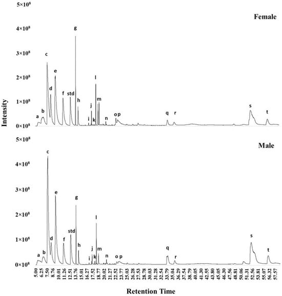 Representative chromatogram of volatiles in the feces of female and male cats. Letters a–t correspond to the candidate molecules in Table 4. Std: standard.