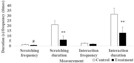 Cats preferred (p ≤ 0.07) the control scratcher over the volatile-treated scratcher when main treatment effect was tested using Wilcoxon sighed rank test. Longer duration of scratching (21.19 ± 3.8 s vs. 6.08 ± 3.8 s; p < 0.0001) and interaction (31.54 ± 5.9 s vs. 12.90 ± 5.9 s; p = 0.0001) and a trend of higher scratching frequency (1.49 ± 0.3 times vs. 0.82 ± 0.3 times; p = 0.07) were observed during the 20min period for the control scratcher compared to the volatile-treated scratcher (Figure 4).