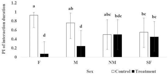 The effects of the interaction between sex, female (F, n = 7), male (M, n = 7), spayed female (SF, n = 7), and neutered male (NM, n = 7), and treatment (i.e., control versus volatile-treated standing cardboard scratcher) on the back-transformed preference index (PI) of interaction duration from arcsine square root transformation. The error bars indicated 95% confidence interval for the back-transformed data. a,b,c,d Least squares mean of arcsine square root transformed data differed within each measurement with different letters.