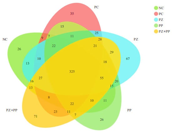 There are 325 OTUs in the NC, PC, PZ, and PZ + PP groups (Figure 1). The unique OTUs in the NC, PC, and PP groups are 26, 35, and 26, respectively. The PZ and PZ + PP groups have a higher number of unique OTUs at 67 and 71, respectively.