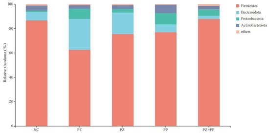 After conducting a clustering analysis of the total reads based on sequences with an identity ≥ 97%, Firmicutes, Bacteroidetes, Proteobacteria, and Actinobacteria are the dominant microbiota at the level of the cecal microbiota community (Figure 2). The relative abundance of Firmicutes in the NC, PC, PZ, PP, and PZ + PP groups was 86.56%, 62.65%, 75.39%, 77.01%, and 87.75%, respectively. The relative abundance of Bacteroidetes in the NC, PC, PZ, PP, and PZ + PP groups was 7.06%, 25.15%, 17.74, 6.35%, and 2.58%, respectively. The relative abundance of Proteobacteria in the NC, PC, PZ, PP, and PZ + PP groups was 1.04%, 8.59%, 2.83%, 9.17%, and 5.30%, respectively.