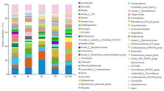 From Figure 3, at the genus level, the community microorganisms are mainly concentrated in Lactobacillus, Prevotella, Blautia, norank_f_T34, and Sarcina. The relative abundance of Lactobacillus in NC, PC, PZ, PP, and PZ + PP groups was 9.12%, 9.71%, 21.19%, 8.40%, and 12.44%, respectively. The relative abundance of Prevotella in the NC, PC, PZ, PP, and PZ + PP groups was 4.32%, 13.95%, 12.23%, 3.16%, and 0.66%, respectively. The relative abundance of Blautia in the PC, PZ, PP, and PZ + PP groups decreased by 6.44–8.46% compared to the NC group. The relative abundance of Sarcina in the PC group, PZ group, and PP group decreased compared to the control group, while the relative abundance in the PZ + PP group increased.