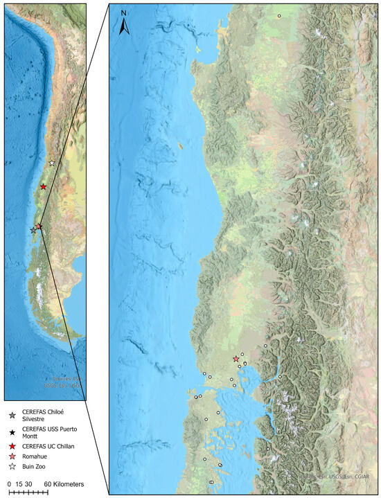 Pudu sera were obtained from the serum banks maintained by three Chilean rehabilitation centers (Chiloe Silvestre, Chiloe Island, Los Lagos District; Universidad San Sebastian Veterinary Faculty, Puerto Mont, Los Lagos District; Universidad de Concepcion Veterinary Faculty, Chillan, Ñuble District), and two under-human-care populations (Buin Zoo, Buin, Metropolitan District; Fundacion Romahue, Los Lagos District) (Figure 1). All the animals come originally from all over its known distribution range in Southern Chile, from Maule district to Chiloe Island, and were collected between 2011 and 2023 by the veterinary staff of these centers. Sources for these serum banks included animals subjected annually to medical check-ups in under-human-care centers. In the rehabilitation centers, most of the animals enter because of health issues, mainly dog attacks, infectious diseases, vehicle collisions and other causes. Sera were stored in individual cryo-vials and frozen at −20 °C until use for serology. For this study, we used samples from all the animals available at the serum banks. Epidemiological information for wild and captive pudus, including sample origin, sampling date, health status, sex, and age, was gathered from each animal, whenever possible.