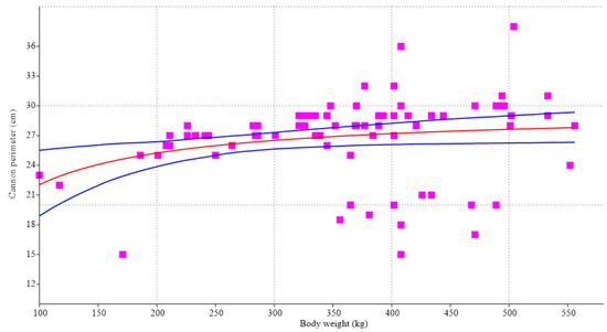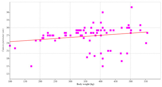 The body weight ranged from 100 to 566 kg (X = 363.5 ± 103.4 kg), while the cannon perimeter ranged between 15 and 38 cm (X = 26.7 ± 4.17 cm), which did reflect a bivariate correlation (rs = 0.355; p = 0.0012). The cannon perimeter also appeared to be correlated with age (rs = 0.275; p = 0.0139).