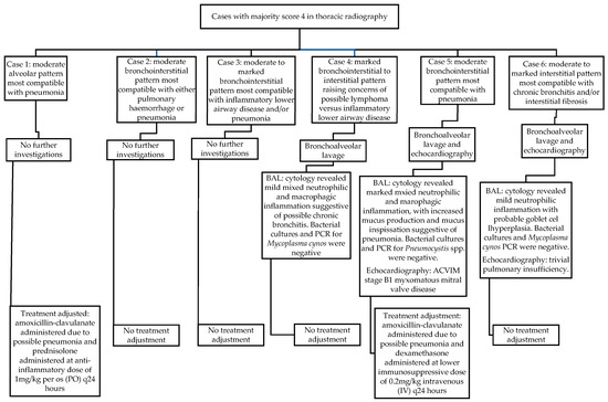 One dog out of these six did not undergo further diagnostic investigations in actuality, but received immediate adjustment to its case management based solely on abnormal thoracic radiographic findings, and without further investigations, in the form of antimicrobial therapy and reduced corticosteroid dosing due to concerns of aspiration pneumonia. Although this patient had not initially presented with respiratory signs, the attending clinician did consider the aspiration pneumonia a potential associative disease process for its IMPA (type II).