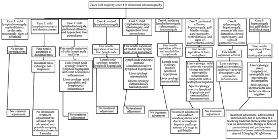 In abdominal ultrasonography, a total of nine cases had significant abnormalities considered (majority score of 4). Of these nine cases, two presented initially with gastrointestinal signs (one with dysphagia and one with diarrhoea). One of these nine cases presented with haematuria and was diagnosed with a urinary tract infection on urine analysis obtained via cystocentesis (urine analysis performed as standard investigations for IMPA). The abnormal findings documented in the seven cases who underwent further sampling were predominantly noted in the lymph nodes (lymphadenomegaly), spleen (splenomegaly), and liver (hepatomegaly and altered parenchymal echogenicity). In the majority of these cases, cytology was most compatible with the inflammatory changes [25] and thus may reflect the response to the patient’s underlying IMPA.