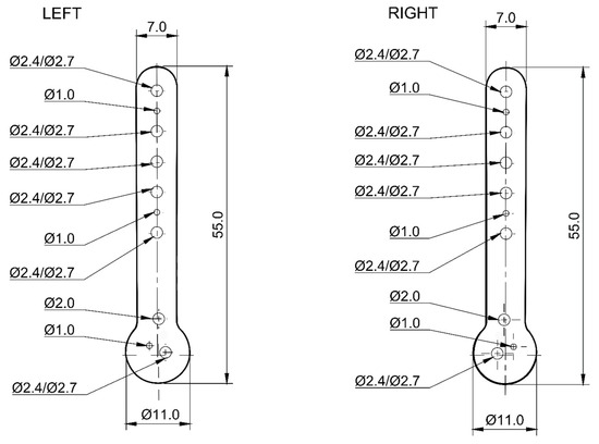 Figure 1. Diagram of anatomically pre-contoured interlocking bone plates showing the distribution of holes for locking screws and Kirschner wires (dimensions in mm).