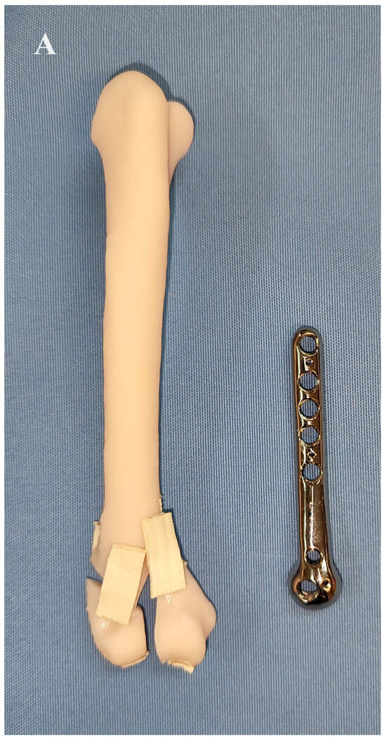 Surgeries were performed on 15 pairs of front limbs amputated at the scapula. The limbs were obtained from 15 adult cats without obvious pathology of the skeleton—8 males and 7 females—aged from 2 to 17 years with the arithmetic mean (±SD) of 9.7 ± 3.5 years. Nine were domestic short haired (DSH) cats (60%), 5 domestic long haired (DLH) cats, and one Cornish Rex. Their body weight ranged from 3.0 to 4.5 kg with the arithmetic mean (±SD) of 3.7 ± 0.5 years. The animals died or were euthanised for reasons unrelated to this study. Ethical approval was not required for this study according to Polish legal regulations (The Act of the Polish Parliament of 15 January 2015 on the Protection of Animals Used for Scientific or Educational Purposes, Journal of Laws 2015, item 266). After flexion of the elbow and subperiosteal elevation of the anconeus muscle, the humeral Y-T fractures were created using a bone chisel and mallet.
