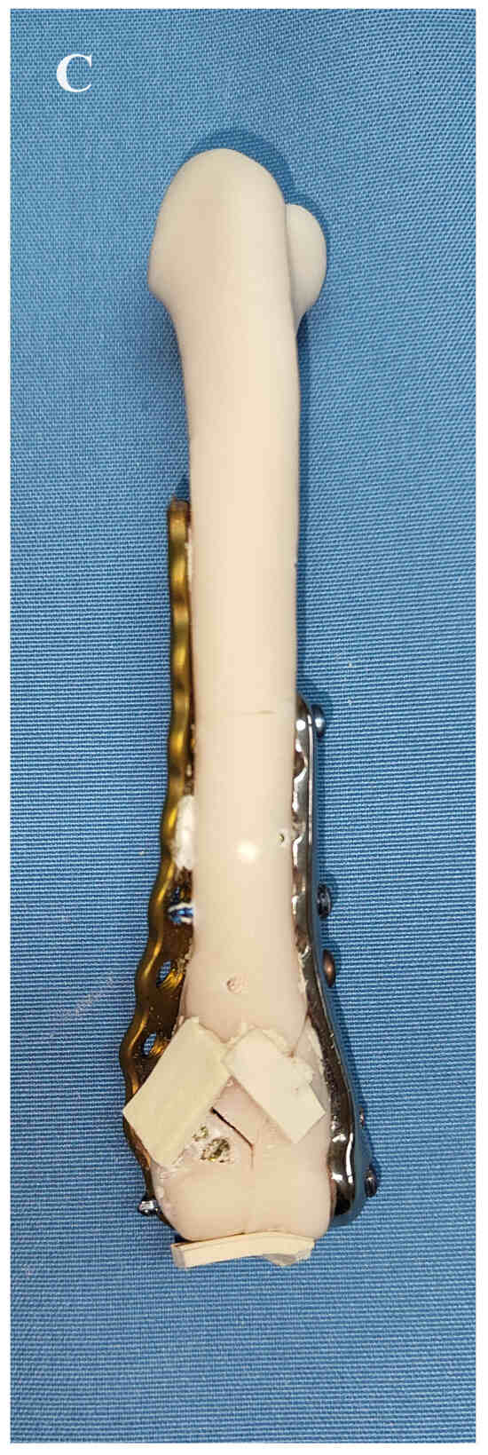 Reduction and stabilisation of the Y-T fracture of the right humerus on the 3D printed bone model. (A–C) After conversion of the bicondylar fracture to a monocondylar lateral fracture using the printed plate, the lateral part of the fracture was stabilised with a 2.4/2.7 locking plate.