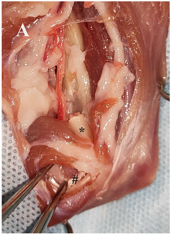Medial approach to the right humerus and insertion of the 3D printed plate in an adult female domestic cat. (A,B) Exposure of the medial surface of the right humerus. Release of the brachial artery, brachial vein and median nerve from the supracondylar foramen after removal of its medial border (asterisk). Exposure of the medial part of the humeral condyle (grid) after dissection between the pronator teres muscle and the antebrachial flexor muscles. Conversion of the bicondylar fracture to a monocondylar fracture using the printed plate. (C,D) Final stabilisation of the medial and lateral part of the Y-T fracture.