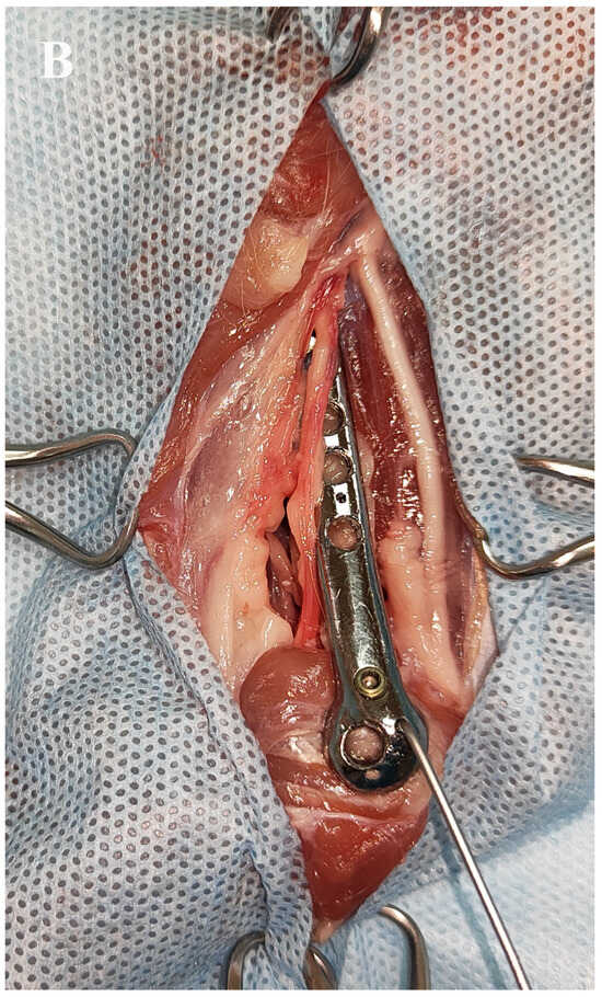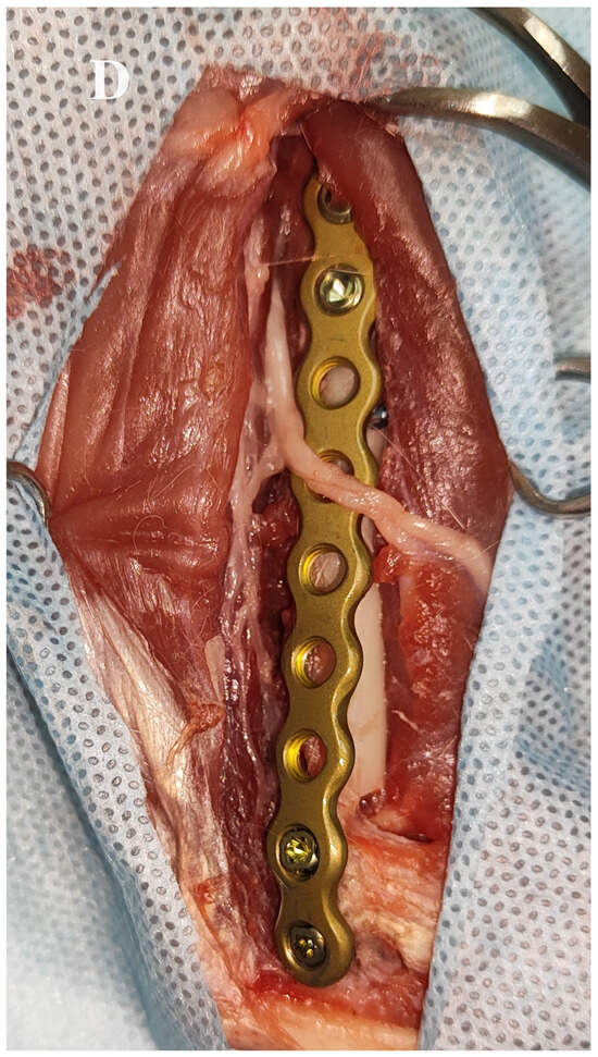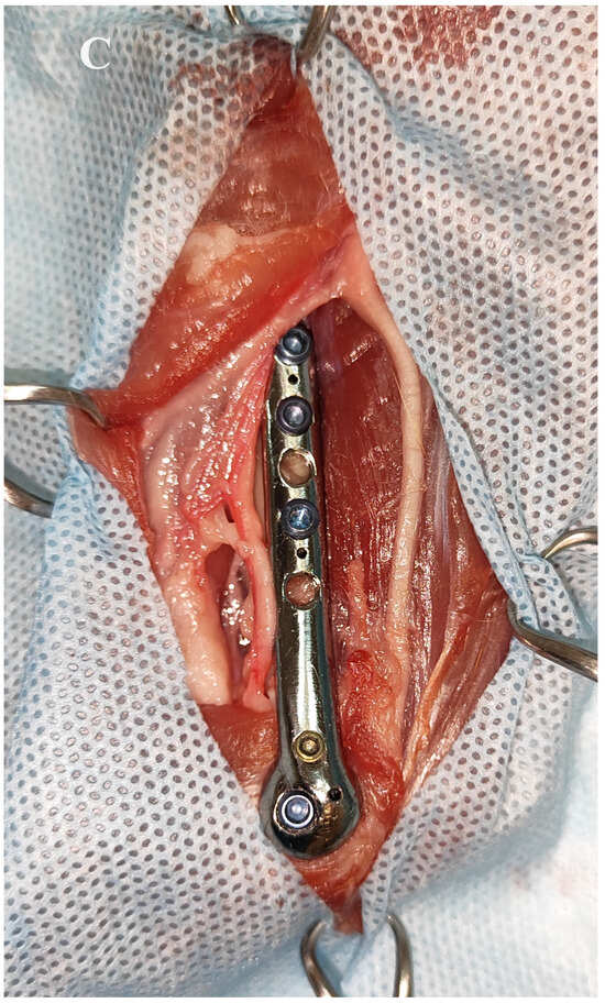 Bone plates are the most commonly used internal fixation devices, and they are manufactured in various sizes and shapes to accommodate different patients [8]. However, a challenge arises when there is a geometrical mismatch between the size and shape of the patient’s bone and the standard plate implant [8,9,10]. In such cases, accurately positioning the plate becomes difficult, and the treatment may be complicated by inadequate load transfer during the bone healing process. Anatomically pre-contoured plates are now the standard of care for the internal fixation of periarticular fractures in humans. Often, they require minimal or no intraoperative contouring. For complex cases, such plates also assist the surgeon as an anatomical template during fracture reduction [10,11,12,13]. To address this issue, personalised plate implants have been introduced. Pre-contoured interlocking compression plate systems have been used in the repair of distal humeral fractures in humans with good to excellent clinical outcomes [14,15]. These implants are specifically customised to align with the patient’s bone anatomy and meet the requirements of the surgeon [8,9,10,11,12].