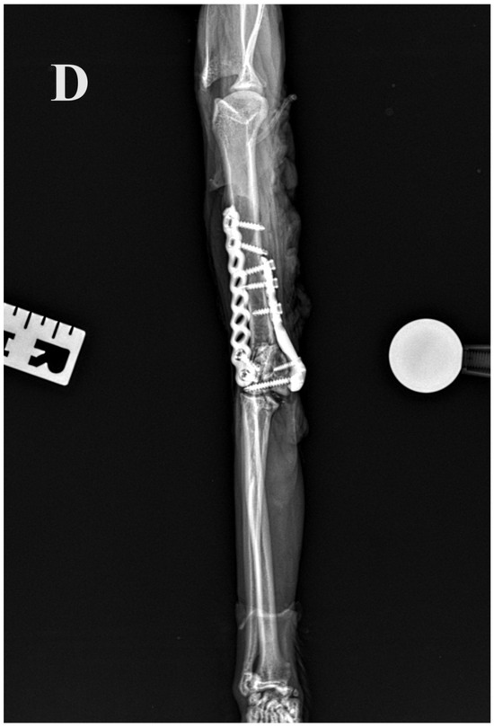 (A,B) Initial lateral and cranio–caudal radiographs of the right forelimb of a female domestic cat show a displaced Y-T fracture. (C,D) Postoperative lateral and cranio–caudal radiographs show a small articular surface defect (<1 mm) of humeral condyle and adequate alignment, adjacency and apparatus (2.0/2.4/2.7 3D printed plate, 2.4/2.7 straight interlocking bone plate and screws).
