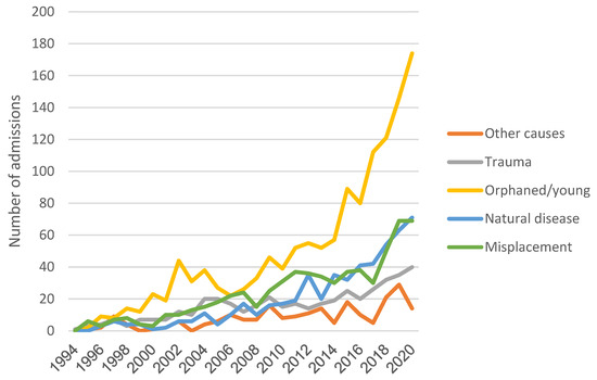 Most of the admissions were concentrated in spring and summer (69%) and only 10% of them occurred in winter. An overall increase in young animal admissions over the period of study was observed with a second peak in autumn and winter.
