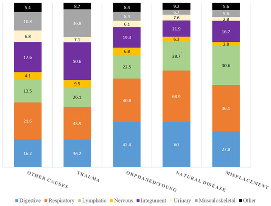 When lesions were grouped by physiological organ systems, no statistically significant differences were observed between species or sexes. On the other hand, adults had higher frequency of respiratory (56.8% vs. 46.8%; χ2 = 8.6; df = 1; p = 0.004), integument (32.8% vs. 25.8%; χ2 = 5.3; df = 1; p = 0.023), and lymphatic lesions (33.4% vs. 26.9%; χ2 = 4.4; df = 1; p = 0.035) than young animals. Regardless of the cause of admission, digestive and respiratory lesions had the higher frequencies, mostly in the categories of natural disease and orphaned/young. Lesions affecting the musculoskeletal system and the integument were more frequent in trauma-related admissions. Macroscopic lesions according to the cause of admission are presented in Figure 3.