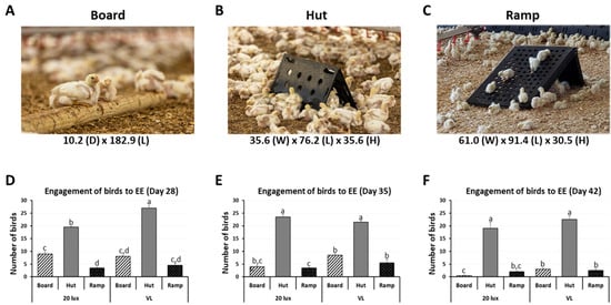 Effects of the three different environment enrichments (board, hut, and ramp) on engagement of birds at different ages. (A–C) Three commercially available enrichments placed in trial 1, 20 lx and VL houses. Enrichment dimensions: Board; 10.2 cm (diameter) × 182.9 cm (long), Hut; 35.6 cm (wide) × 76.2 cm (long) × 35.6 cm (height), Ramp; 61.0 cm (wide) × 91.4 cm (long) × 30.5 cm (height). (D–F) Weekly number of engaged birds was observed on day 28, 35, and 42 for each enrichment. Data (mean ± SEM) were compared among treatments. Different lower-case letters above the bars denote significant differences (p < 0.05) among groups.