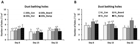 Effects of the three different enrichments (board, hut, and ramp) on the number of dustbathing holes in different light condition and ages. In each section of trial 1, 20 lx houses (A) and VL houses (B), dustbathing holes as the evidence of dustbathing behavior were counted at 8, 15, and 22 days of age. Dustbathing holes were observed in nine parts of each section and the number of holes per 5 m2 was determined. Data (mean ± SEM) were compared among treatments. Different lower-case letters above the bars denote significant differences (p < 0.05) among groups.