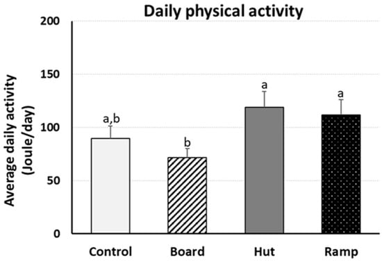Effects of the different environmental enrichments (board, hut, and ramp) on daily physical activity. In each section of trial 1 VL houses, an activity tracker, Animo, was installed on birds using harness at 43 days of age and uninstalled at 48 days of age (n = 8 birds/trt, 4 birds/section, 2 VL houses). Average daily activity (calorie consumption) for each bird from day 44 to day 47 was obtained. Data (mean ± SEM) were compared among treatments (control, board, hut, and ramp). Different lower-case letters above the bars denote significant differences (p < 0.05) among groups.