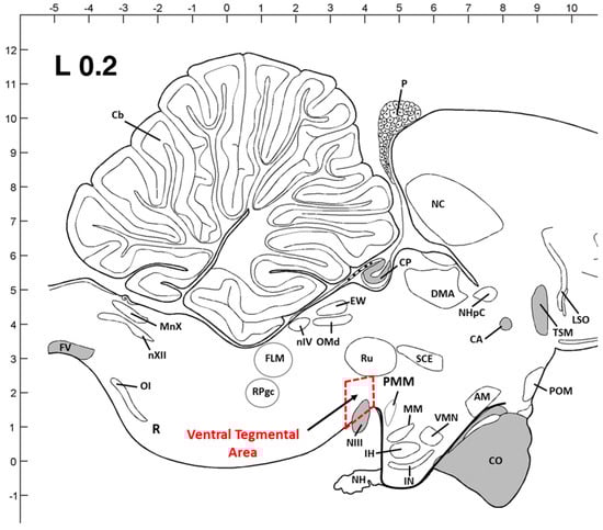 Sagittal view of dissection area of the chicken midbrain (Ventral Tegmental Area). Dimensions of dissected tissue are coronally 3–3.5 mm (W) × 2–3 mm (H) × 1–1.2 mm (L) for VTA. The thickness (W, H, and L) was adjusted proportionally from young birds to older birds based on brain size and structure. Abbreviations used: AM: anterior medial hypothalamic nucleus; CA: anterior commissure; Cb: cerebellum; CO: optic chiasma; CP: posterior commissure; DMA: dorsomedial nucleus; EW: Edinger–Westphal nucleus; FLM: medial longitudinal fasciculus; FV: ventral fasciculus; IH: inferior hypothalamic nucleus; IN: infundibular hypothalamic nucleus; LSO: lateral septal organ; MM: medial mammillary nucleus; MnX: nucleus motorius dorsalis nervi vagi; NC: caudal neostriatum; NH: neurohypophysis; NHpC: nucleus of the hippocampal commissure; NIII: oculomotor nerve; nIV: trochlear nerve nucleus; nXII: hypoglossal nerve nucleus; OI: inferior olivary nucleus; OMd: dorsal oculomotor nucleus; P: pineal gland; POM: medial preoptic nucleus; PVN: paraventricular nucleus; RPgc: nucleus of caudal pontine reticular gigantocellular; Ru: red nucleus; SCE: stratum cellular externum; TSM: septopallio-mesencephalic tract; Top VMN: ventromedial hypothalamic nucleus.