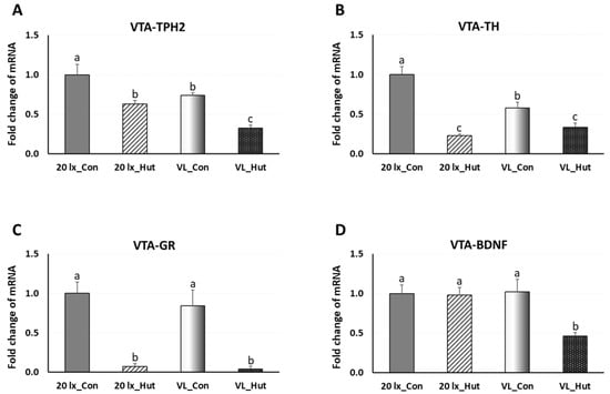 To investigate the long-term effects of enrichment huts in the 20 lx and VL houses on the previously identified broiler welfare marker genes in the VTA (Figure 4), expressional changes of TPH2, TH, GR, BDNF, and Opn4 genes were determined in the VTA of broilers’ midbrain at 42 days of age (Figure 5 and Figure 6F). Expression of TPH2, an indicator of serotonergic activity in the VTA, in 20 lx birds was downregulated by EHs, and the decreased TPH2 expression in the VL birds compared to 20 lx control birds was further downregulated by EHs (p < 0.05). TH expression, an indicator of DAergic activity, was the highest in 20 lx birds (20 lx_Con) among other birds (p < 0.05), and there were significant decreases in TH expression in 20 lx_Hut and VL_Con birds (p < 0.05). In the VL birds, EHs affected the downregulation of TH expression compared to VL_Con birds (p < 0.05). Both VTA-GR expressions, a stress response indicator in VTA, in 20 lx and VL birds were strongly downregulated by EHs treatment, indicating the lower stress status in EHs-treated birds compared to 20 lx and VL control birds (p < 0.05). There was no difference in VTA-BDNF expression, a social stress indicator in VTA, in 20 lx birds by EHs treatment (p > 0.05), but EHs decreased VTA-BDNF expression significantly in the VL birds. VTA-Opn4 expression was affected by the enriched lighting program as we observed previously [10]. EHs further decreased VTA-Opn4 expression of VL birds (p < 0.05).