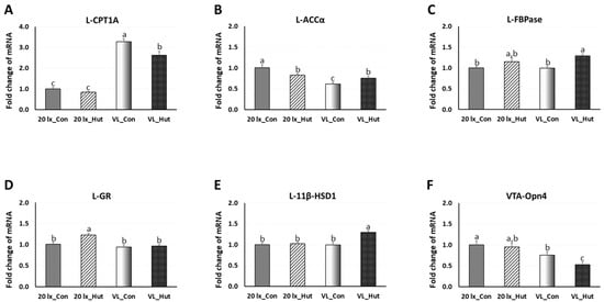 Expression changes of hepatic (A) L-CPT1A (liver carnitine palmitoyl transferase 1), (B) L-ACCα (liver acetyl-CoA carboxylase alpha), (C) L-FBPase (liver Fructose -1,6-bisphosphatase), (D) L-GR (liver glucocorticoid receptor), and (E) L-11β-HSD1 (liver 11 β-hydroxysteroid dehydrogenease-1) genes and (F) VTA Opn4 gene. Total RNA was extracted from liver and macro dissected VTA tissues and used for real time RT-qPCR. Data were set as the relative fold changes of expression levels using the ΔΔCt method with GAPDH, β-actin, and 18S as internal controls. Data (mean ± SEM) were expressed from a value set for 1.0 for 20 lx_Con birds at 14 days of age. Different lower-case letters above the bars denote significant differences (p < 0.05) among groups.