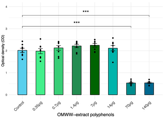 IPEC-J2 viability after a 24 h exposition to the extract of liquid olive mill waste-water (OMWW) polyphenols (OMWW-EP: 0.35 μg; 0.7 μg; 1.4 μg; 7 µg; 14 µg; 70 µg; 140 µg). Cell viability was determined with XTT test. The number of living cells is expressed as optical density (OD) ± standard error (SE) and dots indicate samples included in each group. Statistical difference was calculated for all groups vs. Control (untreated cells): *** p < 0.001.