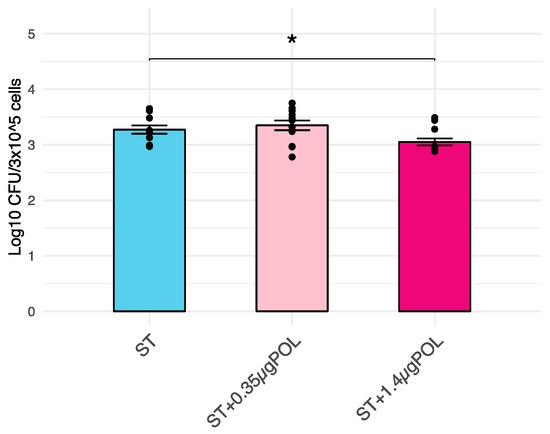 Effects of OMWW-extract polyphenols (OMWW-EP) on S. typhimurium penetration into IPEC-J2 cells. Data are expressed as log10 CFU of penetrated, intracellular ST/3 × 105 cells. The mean value of five replicates + standard error is presented, and dots indicate samples included in each group. The significant difference between S. typhimurium infected cells and pretreated with different concentrations of OMWW-EP (ST + 0.35 µg POL—pink; ST + 1.4 µg POL—fuchsia) and S. typhimurium infected cells (ST—blue) is indicated by * (* p < 0.05).