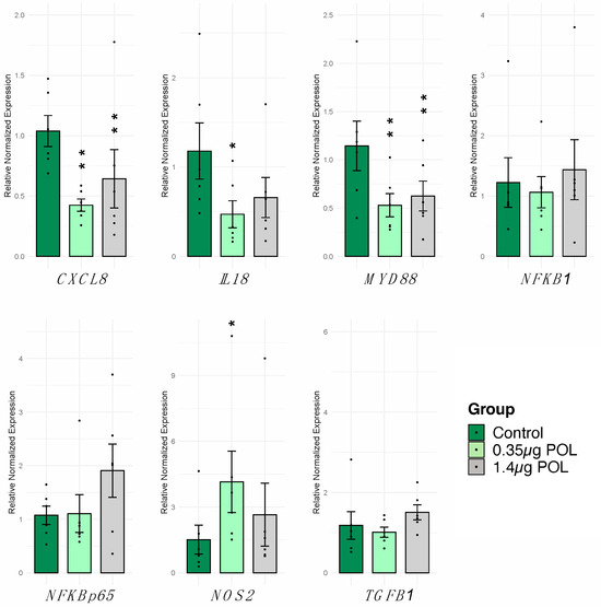 Effects of 24 h OMWW-extract polyphenols on IPEC-J2 gene expression. The RT-qPCR analysis was performed to evaluate CXCL8, IL18, MYD88, NFKB1, NFKB/p65, TGFB1 and NOS2 gene expression. Data are presented as bar plots displaying the mean value of normalized expression, standard error as error bars and dots indicate samples included in each group. For each gene and cytokine, differences between treated with polyphenols (0.35 μg POL—light green; 1.4 μg POL—gray) vs. untreated (Control—dark green) cells were evaluated through one-way ANOVA followed by a Dunnett’s test or a Kruskal–Wallis test followed by Dunn’s multiple comparison test; * p < 0.05, ** p < 0.01.