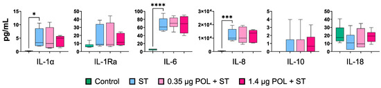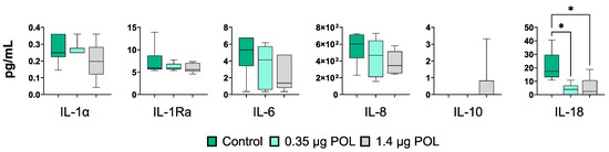 Effects of OMWW-extract polyphenols on IPEC-J2 cytokine release through multiplex ELISA measuring cytokine contents in culture supernatants (IL-1α, IL-1Ra, IL-6, IL-8, IL-10, IL-18). Data are presented as box and whisker plots displaying median and interquartile range (boxes) and minimum and maximum values (whiskers). For each gene and cytokine, differences between treated with polyphenols (0.35 μg POL—light green; 1.4 μg POL—gray) and untreated (Control—dark green) cells were evaluated through one-way ANOVA followed by a Dunnett’s test or a Kruskal–Wallis test followed by Dunn’s multiple comparison test; * p < 0.05.