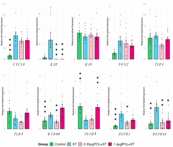 Gene expression of IPEC-J2 cells in response to S. typhimurium infection with OMWW-extract polyphenol (OMWW-EP) pre-treatment. The tested conditions for IPEC-J2 cells were: uninfected and untreated cells (Control—dark green), infected with S. typhimurium (ST—blue), pre-treated with 0.35 µg OMWW-EP and infected (0.35 µg POL + ST—pink), and pre-treated with 1.4 µg OMWW-EP and infected (1.5 µg POL + ST—fuchsia). Data are reported as mean value and standard error, and dots indicate samples included in each group. Statistical tests were carried out comparing all conditions vs. ST. Significant differences: * p < 0.05, ** p < 0.01, *** p <0.001.