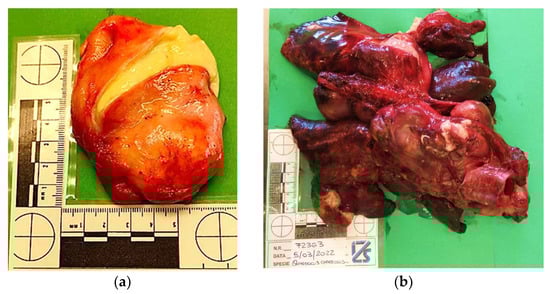 The postmortem condition was adequate and the carcass was fresh. Upon external examination of the carcass, the skin condition was good despite a severe tick infestation, especially in the pectoral and pelvic regions. Palpation led to the identification of generalized lymphadenopathy and subcutaneous lumps in the neck and axillary regions. After flaying, the carving of superficial lymph nodes highlighted purulent to caseous, greenish-yellow and viscous material (Figure 1a), with multifocal and encapsulated features. Thus, purulent lymphadenitis with abscess formation from 3 × 4 cm (neck region) to more than 9 × 7 cm (axillary region) was assessed. Subcutaneous lumps and swellings were also found to be abscesses. Abdominal cavity inspection showed no major alterations, and both the entire gastrointestinal tract and urinary bladder were empty. A pregnancy of at least 3 months was observed after fetus examination, where no macroscopic lesions were identified. In the thoracic cavity, the lungs displayed severe purulent pneumonia with dozens of abscesses of different sizes, ranging from 5 mm to 100 mm (Figure 1b), and large areas of consolidation in the caudal lung lobes. No signs of traumatic injuries were identified.