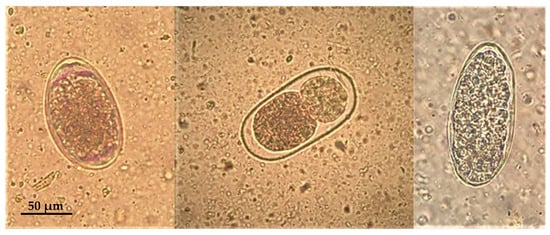 Parasitological examination for the intestinal (cecum and rectum) content was carried out using 1300 SG flotation solution (composition: sodium nitrate, 540 g; sucrose, 360 g, in 1000 mL of tap water).