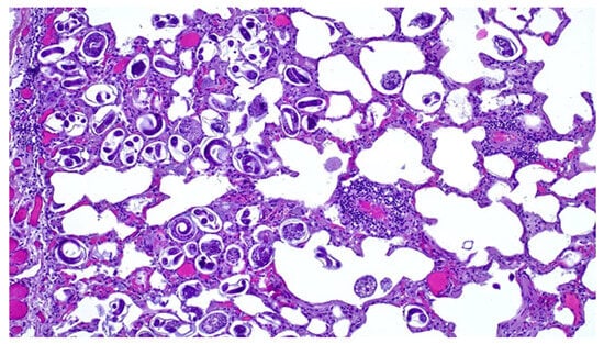 Bacterial pulmonary pathology associated with C. pseudotuberculosis is exacerbated by verminous bronchopneumonia related to the presence of high numbers of nematode eggs and larvae, which is particularly severe in the caudal lobes. Several studies have reported a prevalence of Dictyocaulus spp. in the lungs of roe deer in fairly similar climatic areas [,,]. Although the pathogenic significance of nematode infestation in wild ruminants is still controversial, some authors have hypothesized that susceptibility to infestation is closely linked to the poor condition of the animal [], so we could assume that the severity of parasitic pneumonia is related to, or perhaps a contributing cause of, the severely compromised health status of the animal, creating conditions for bacterial dissemination.