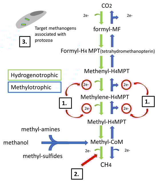 Hydrogenotrophic and methylotrophic pathways producing CH4 product from H2/CO2, methanol, methylamines, methyl sulphides as substrates for methanogenesis. Feed additive methods of CH4 mitigation include (1.) H2 scavenging of H2 oxidation to H+ in the hydrogenotrophic pathway and H2 accumulation from the methylotrophic pathway; (2.) inhibiting 3–hydroxy–3–methyl–glutaryl coenzyme A (HMG–CoA); and (3.) targeting membranes of ciliate protozoa hosting dependant methanogens. Figure adapted from Kracker et al. [21].