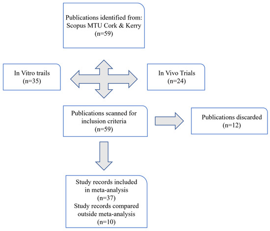 A systematic literature review was constructed using peer-reviewed publications that involved the feed additive compounds of interest listed above. Publications were obtained from the Munster Technological University Scopus database [103] using key search words including CH4, rumen, and the natural feed additive of interest. No date range was established when accumulating publications regarding any of the search terms in Scopus, therefore eliminating this limiting factor. Criteria for each document to be integrated into the database required (1) the research to be carried out on CH4 emissions produced by beef and dairy cattle; (2) that CH4 emissions were directly measured using recognised methods and not through prediction methods; and (3) that investigations were carried out in vivo when adequate numbers were available, or were carried out in vitro where necessary. The listed supplementary feed compounds were selected based on their potential to be enteric methane mitigators and benefit animal productivity, and based on their signs of an optimum dosage rate.