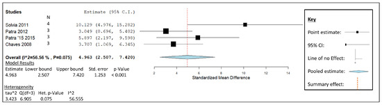 Figure 3 shows the published studies on GO that were included in the meta-analysis; they involve data generated using an in vitro experimental approach, a dosage range of 250–300 mg/L culture fluid, similar diets of mixed forage with concentrate, and large ruminant lactating animals, as listed in Table 2. The graphical representation details the statistical significance of garlic oil as a CH4 mitigation contender (Figure 3). The weight given to each study can be observed by the size of each box, which represents the influence each study has on the overall effect. The increased influence of Patra and Yu’s study due to retaining the least associated inverse variance can be observed when compared to the remaining studies [6]. The weight was distributed accordingly, as follows: [9] 15.20%, [6] 32.29%, [43] 30.01%, and [44] 22.49%. A closer examination of the plot reveals that the study of Soliva [9] is the only study with a confidence interval (CI) that does not cross the line of summarised effect, while also having the greatest point estimate out of the four studies. The remaining studies that also contribute to the summarised effect are statistically significant on an individual level, as devised by their positive standardised mean difference (SMD) values. The summary effect calculated at 4.963 SMD is identified by the dotted red line on the graph. The 95% CI generated a lower limit of 2.507 and an upper limit of 7.420. The weighted average is shown at the bottom of the plot as a diamond, with the centre point indicating the pooled effect size and its width displaying the pooled CI range. The pooled effect summary does not cross the line of no effect, represented as point 0,0 on the forest plot. The study’s heterogeneity is shown to be insignificant, as the effect sizes displayed alongside the forest plot include an I2 value of 56.555 and a probability value of 0.075.