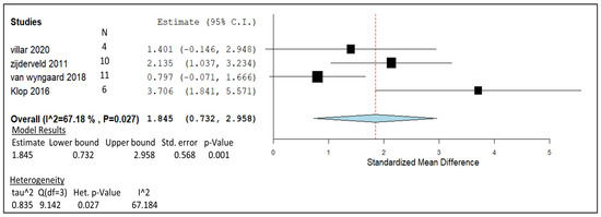 The meta-analysis provided in Figure 5 demonstrates CH4 gas yield in the form of grams per kg of DM from nitrate treatment in ruminants. The forest plot was generated using similar units from the following in vivo studies [10,48,108,109]. These results, which were obtained following adjustment periods of the nitrate feed additive, allowed for adaptation and the avoidance of nitrite buildup, as mentioned in previous sections. Based on the box representation of weights on the plot, the weight appears to be quite evenly spread across each of the studies, with slightly more influence towards the study with a higher supplement dose [109]. The weight distribution for each study was split accordingly, as follows [109] 31.28%, [48] 28.07%, [10] 22.12%, and [108] 18.53%. Based on the I2 value (67.18%) and p-value (0.027), the heterogeneity of the overall meta-analysis can be deemed significant. The pooled effect size of each of these studies provided a summarised effect at 1.845 and an average 95% CI that extends from 0.732 to 2.958, which does not cross the line of no effect. On an individual level, studies carried out by van Wyngaard and Villar do cross the line of no effect [10,109]. The p-value given to this model at 0.001 demonstrates the statistical significance of this analysis.