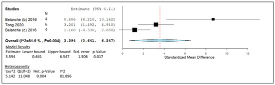The statistical analysis in Figure 6 was generated from in vitro trials mentioned in Table 5. These studies contributed to the estimated line of effect which had a value of 3.594, indicated by the dotted red line in the forest plot. The individual effect size of the three studies generated a pooled summary that ranged from 0.641 to 6.547 along the x axis. Heterogeneity was calculated and generated a I2 value of 81.9%, thus falling into the high heterogeneity range, with a significant p-value of 0.004. Plotted points generated by both studies by Belanche et al. overlap the study by Tong et al. in relation to Cis; however, the rumen simulation technique (Rusitec) investigation looks to be an outlier in this graphical representation [110]. The meta-analysis model was given a p-value of 0.017. The studies involved were given weight accordingly: 39.64% [61], 38.45% [111], and 21.91% [110].