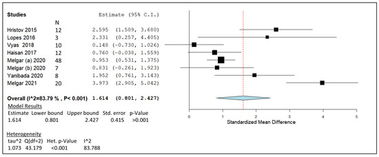 Figure 4 displays the forest plot generated through a meta-analysis of essential oil blends MO and AR from the in vivo studies listed in Table 6. An estimated line of effect for the essential oil mixtures was generated from the included studies, with a value of 0.887. The CI values generated from the included studies generated a pooled summary that had a range of 0.312 to 1.416. The Carrazco et al. [90] study produced the lowest point estimates on the forest plot (Figure 4) and remained the only point estimate situated lower than the line of effect generated. Two of the AR studies’ CIs crossed the line of no effect in the generated forest plot [87,88], followed by a single MO study [106]. In terms of heterogeneity, the analytical results fell into the high-range category, producing an I2 value of 81.38%, which is considered significant due to its <0.001 p-value. An overall p-value of 0.002 for the meta-analysis model was calculated from the data inputs. The weight given to each study in the analysis was split based on sample size and generated the following percentages: 7.3% [86], 8.37% [87], 12.25% [88], 16.77% [89], 11.04% [107], 12.67% [90], 17.01% [106], and 14.54% [91].
