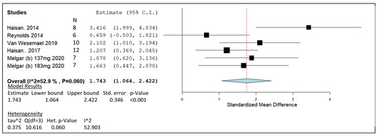 Meta-analysis investigating the 3-NOP lower-dose range of 60–75 mg/kg DMI in vivo. C.I.—confidence interval; std. error—standard error; Het. p-value—heterogeneity p-value. References included [95,96,99,100,101,102,112,113].