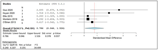 The meta-analysis observed in Figure 9 involves five studies [71,76,120,121,122] conducted to investigate the CH4 abatement effect of 6–9 log CFU/mL L. plantarum as a silage inoculant and directly fed microbial (DFM) supplement. The heterogeneity investigation generated an I2 score of 34.50; however, the related p-value of 0.191 indicated the result to be insignificant. The pooled summary of all study groups is positioned at a range of 0.046 to 1.526, and does not span across the line of no effect. The overall summery affect represented by the red dotted line indicates the result to be 0.786. On an individual study level, all studies except GUO in have lower CIs that cross the line of no effect. The statistical significance of this analysis was determined by a p-value of 0.037. The dataset is weighed out with a slight extra percentage of weight given to Monteiro [121] at 38.93% and O’Brien [122] at 24.21%, followed by Ellis [120] with 15.62%, Huyen [71] with 11.77%, and Guo [76] receiving 9.46% of the weight.