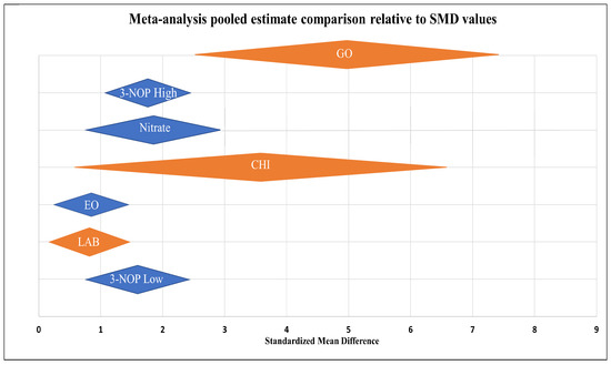 An effect on methane output can be observed in each of the individual meta-analyses mentioned above in Figure 3, Figure 4, Figure 5, Figure 6, Figure 7, Figure 8 and Figure 9. In line with directly comparing in vitro plots with in vitro and in vivo with in vivo plots, the pooled estimates of each supplementation candidate meta-analysis are included in the comparison in Figure 10 above. The labelled pooled estimates are stacked in order of greatest lower bound effect and are measured on a scale of SMD values. GO displays the greatest in vitro CH4-mitigating capacity in Figure 10, based on the compounds’ summarised effect of 4.95 and their CI values. The plotted summarised effect for CHI produced a competing in vitro SMD value (3.58) that was accompanied by the greatest variation observed. On the contrary, the LAB representation in Figure 10 shows the lowest in vitro estimate of 0.79, with greater precision based on CI representation. Nitrate, 3-NOP, and EO in vivo analyses were also compared, with both nitrate (1.85) and 3-NOP at low (1.61) and high (1.74) doses producing similarly sized SMD effect sizes and 95% CI ranges. The summary meta-analysis for EO had the lowest in vivo point estimate of 0.89, but did not show negative in vivo CH4-mitigating abilities (Figure 10). The variability of the in vitro studies involving GO and CHI emphasises the need for further validation in an in vivo system, using optimum dosage information gained from in vitro work.