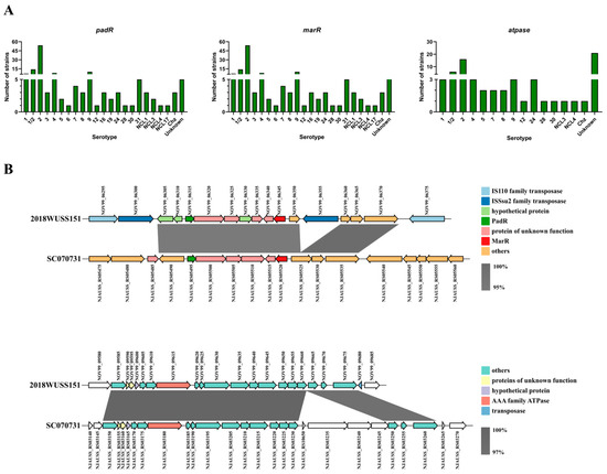 There are abundant and diverse ISs in strains 2018WUSS151 and WUSS030 genomes. Among them, the IS4-like ISSsu2 family is worth mentioning. The members of the IS4-like ISSsu2 family serve as flanking ISs of transposons, and transposases at both ends are arranged in the same, opposite, or reverse direction (Figure 3A). The terminal inverted repeat sequence of ISSsu2 is CAATGTCATTAAGTTAA (Figure 3B). Two putative virulence-associated genes, padR and marR, are passenger genes in transposons. PCR analysis confirmed that the transposases arranged in three ways are able to form circular DNA intermediates during transposition (Figure 3C), suggesting that they could be horizontally transmitted among S. suis strains. As shown in Figure 4A, three putative virulence-associated genes are widely distributed among 148 complete genomes of S. suis strains deposited in NCBI, padR (137/148), marR (138/148), and atpase (67/148). They are also present in 64 serotype 8 strains analyzed in our previous study [22], padR (61/64), marR (61/64), and atpase (29/64), with draft genomes.
