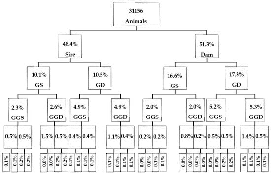 - The pedigree completeness. This provides information on the completeness of the pedigree in each generation as well as the number of missing parental records. The percentage completeness of the pedigree was computed. This was also assessed by calculating the mean maximum number of generations, the mean complete number, and the number of equivalent completed generations [29]. ENDOG includes information on the completeness of each ancestor in the pedigree to the 5th parental generation. The number of discrete generation equivalents was determined because it is considered another way to describe pedigree information [31].
