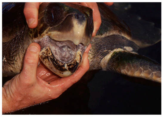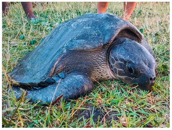 The identification of the turtle by observing its morphological features left no doubt: it was a Kemp’s ridley sea turtle, Lepidochelys kempii (Garman, 1880) [1] (Figure 1, Figure 2 and Figure 3). The curved carapace length (CCL) of this adult female was 62 cm. The amputated left foreleg was reduced to a scarred stump. No other visible wounds were observed.