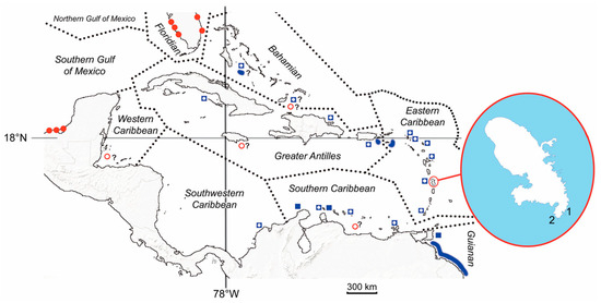 Cartographic representation of our knowledge on the presence of the genus Lepidochelys in the Caribbean region. L. olivacea—open blue square: reported presence; solid blue square: known nesting site; ovoid shape: foraging site. L. kempii—open red circle: reported presence; solid red circle: known nesting site. Magnifying glass: localization of beaching (1) and release (2) of L. kempii in Martinique.