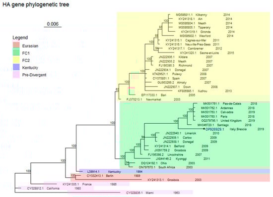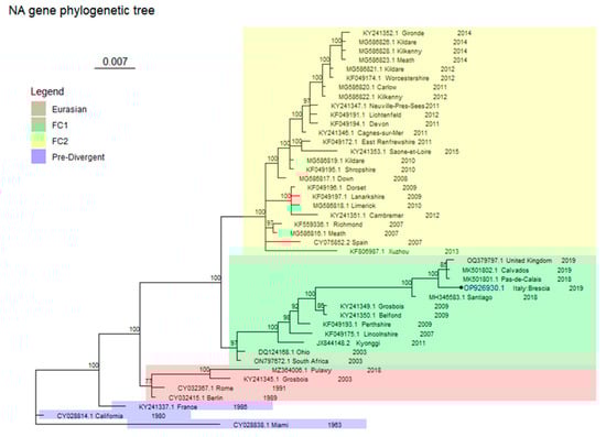 Ricci I, Tofani S, Lelli D, Vincifori G, Rosone F, Carvelli A, Diaconu EL, La Rocca D, Manna G, Sabatini S, et al. First Reported Circulation of Equine Influenza H3N8 Florida Clade 1 Virus in Horses in Italy. Animals. 2024; 14(4):598. https://doi.org/10.3390/ani14040598